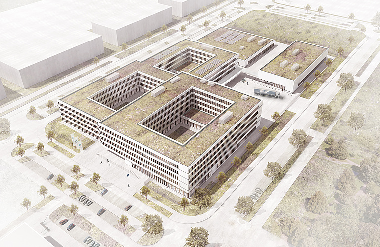 Das Land Nordrhein-Westfalen beschafft ein neues, hochmodernes Verwaltungsgebäude für seine Finanzverwaltung in Kaarst. Das Gebäude wird für mindestens 975 Personen ausgelegt sein und Flächen für Büro- und Besprechungsräume, ein hochverfügbares Rechenzentrum, Druckbereich, Lager und Werkstätten sowie eine Kantine im Umfang von geplant insgesamt ca. 19.000 m² umfassen. Nach einem europaweiten Vergabeverfahren wurde die Landmarken AG aus Aachen damit beauftragt, ein den Nutzeranforderungen entsprechendes Gebäude zu planen, betriebsfertig zu errichten und mindestens 20 Jahre an das Land zu vermieten. Lutz Lienenkämper, Minister der Finanzen des Landes Nordrhein-Westfalen, hat das Vorhaben in der vergangenen Woche der Öffentlichkeit vorgestellt (zur Pressemitteilung).